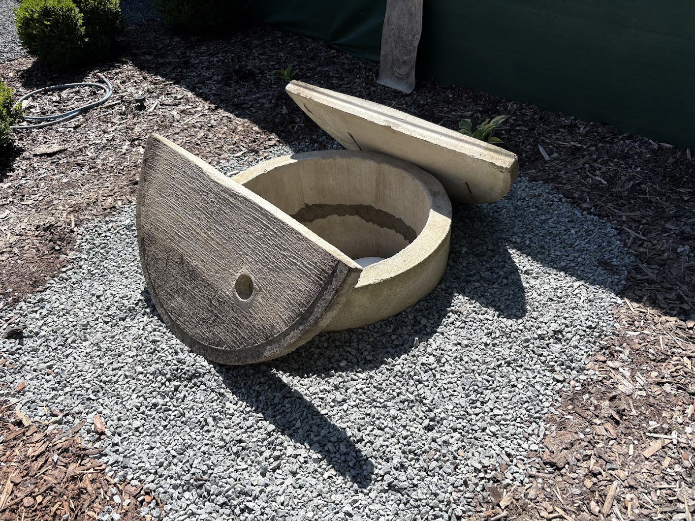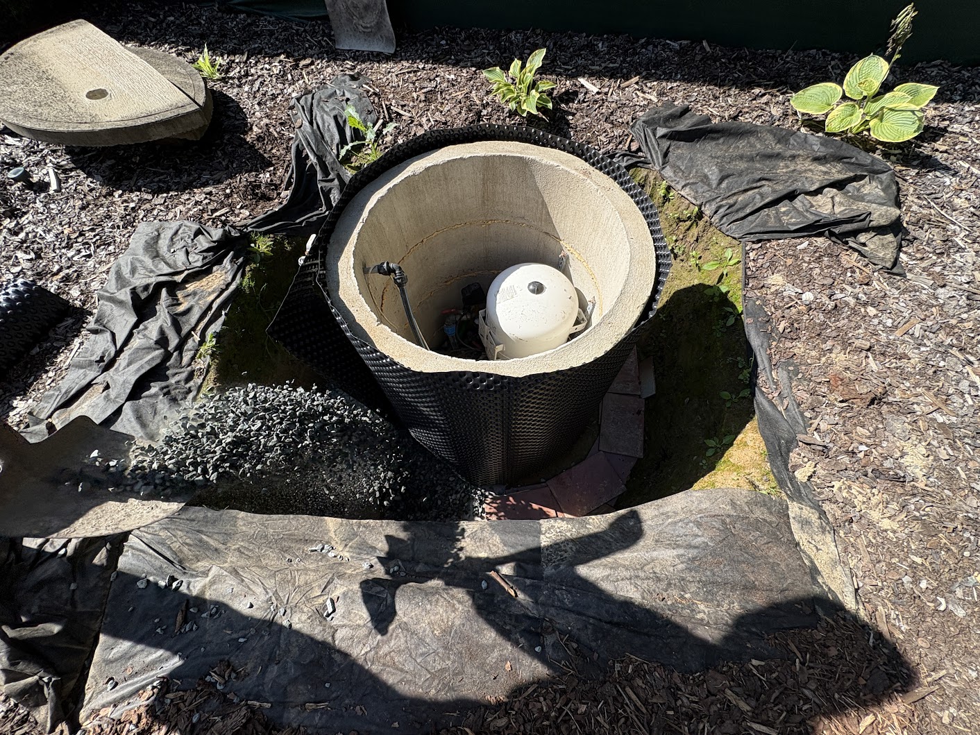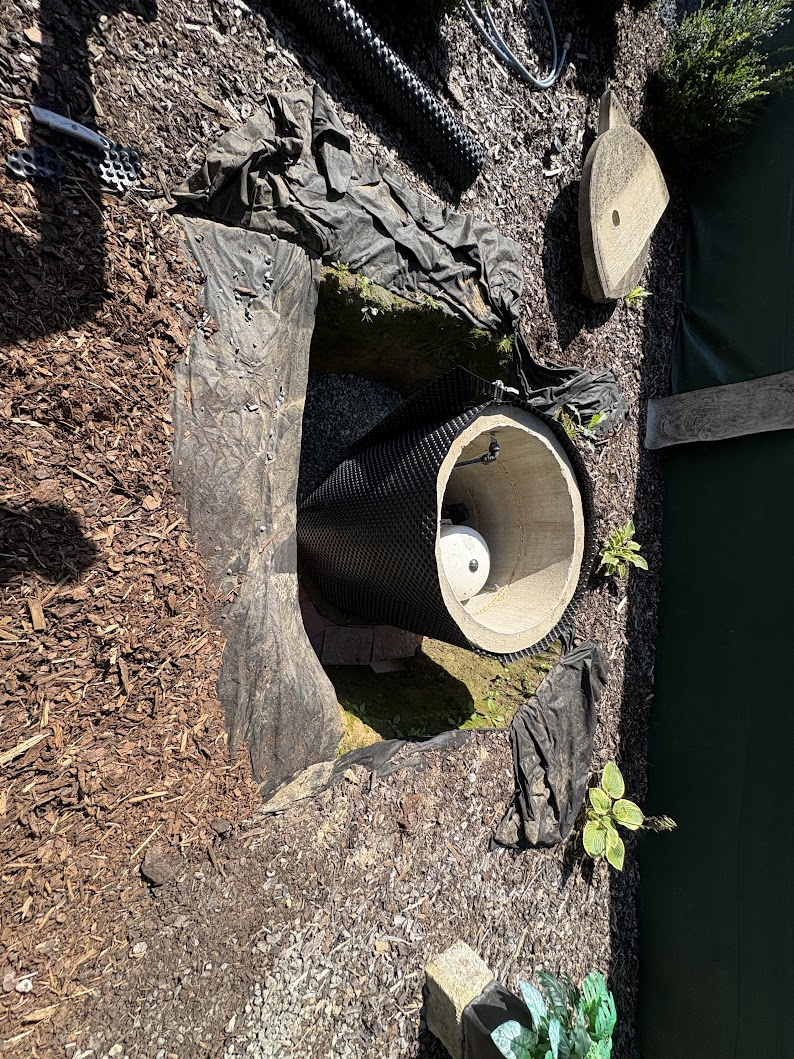 Jedno špatně udělané zhlaví jsme museli správně dokončit. Tedy odkopat kompletně kolem skruží, umístit nopovou fólii a následně zasypat štěrkem o frakci 8/16mm.